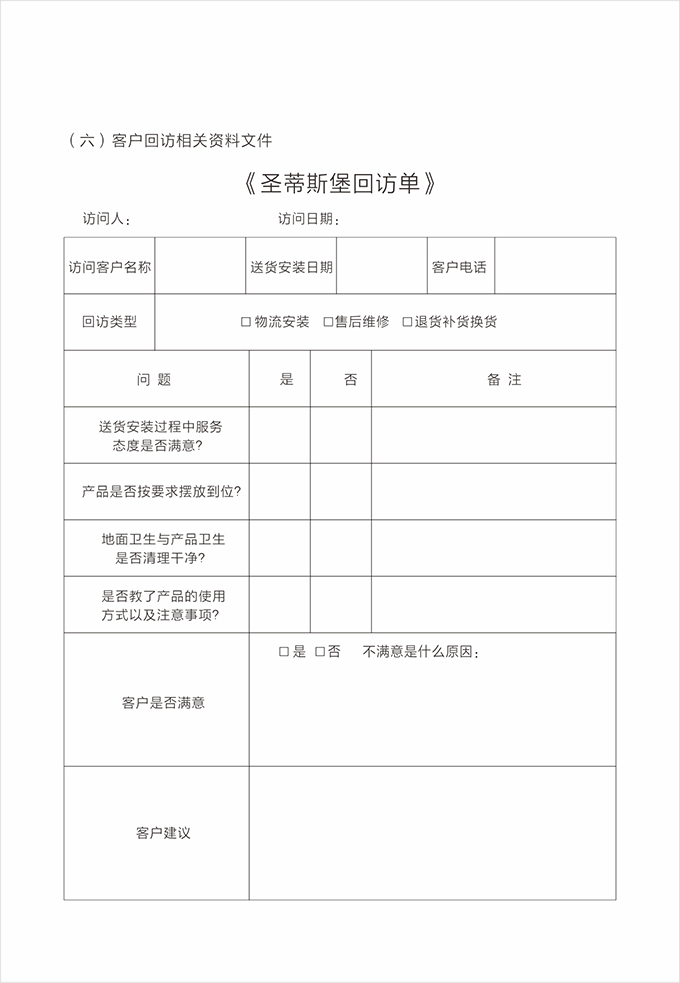 告別之前:告知客戶圣蒂斯堡全國(guó)免費(fèi)服務(wù)電話(售后服務(wù)貼)以及保修方式,請(qǐng)客戶在《產(chǎn)品配送單》上簽名,并填寫《配送滿意度調(diào)查表》后,合影留念。