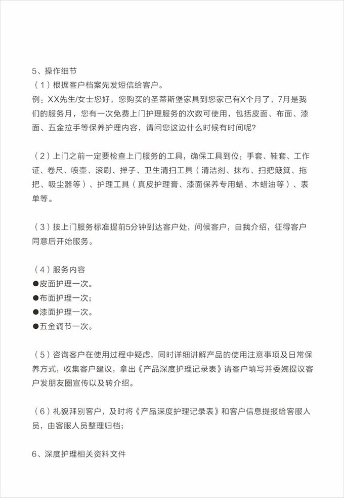 產(chǎn)品處理完畢后必須一站式通檢,指導(dǎo)客戶使用,并將服務(wù)過(guò)程中產(chǎn)生的垃圾隨手帶走,家具維修完畢后,應(yīng)用毛巾將家具擦拭一遍,確保產(chǎn)品清潔。