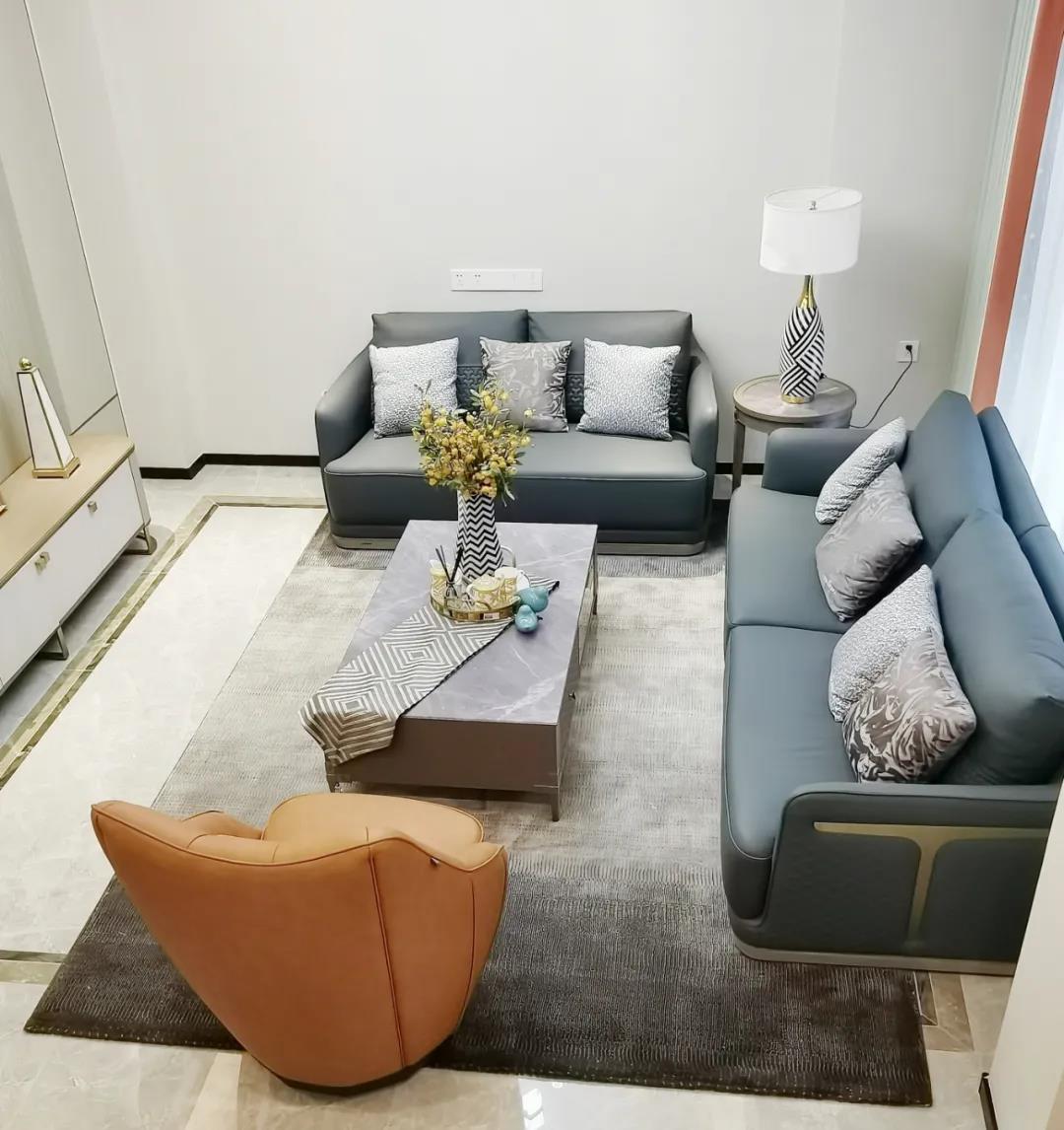 淺灰為基底的飾面與低飽和度的深色沙發(fā)相互映襯,產(chǎn)生強(qiáng)烈的視覺沖擊,深色的家具讓空間從視覺上衍生出一種縱深感。巖玻的質(zhì)感與真皮編織的紋理盡顯現(xiàn)代之美,細(xì)節(jié)陶瓷擺件注滿了空間優(yōu)雅的藝術(shù)氛圍。
