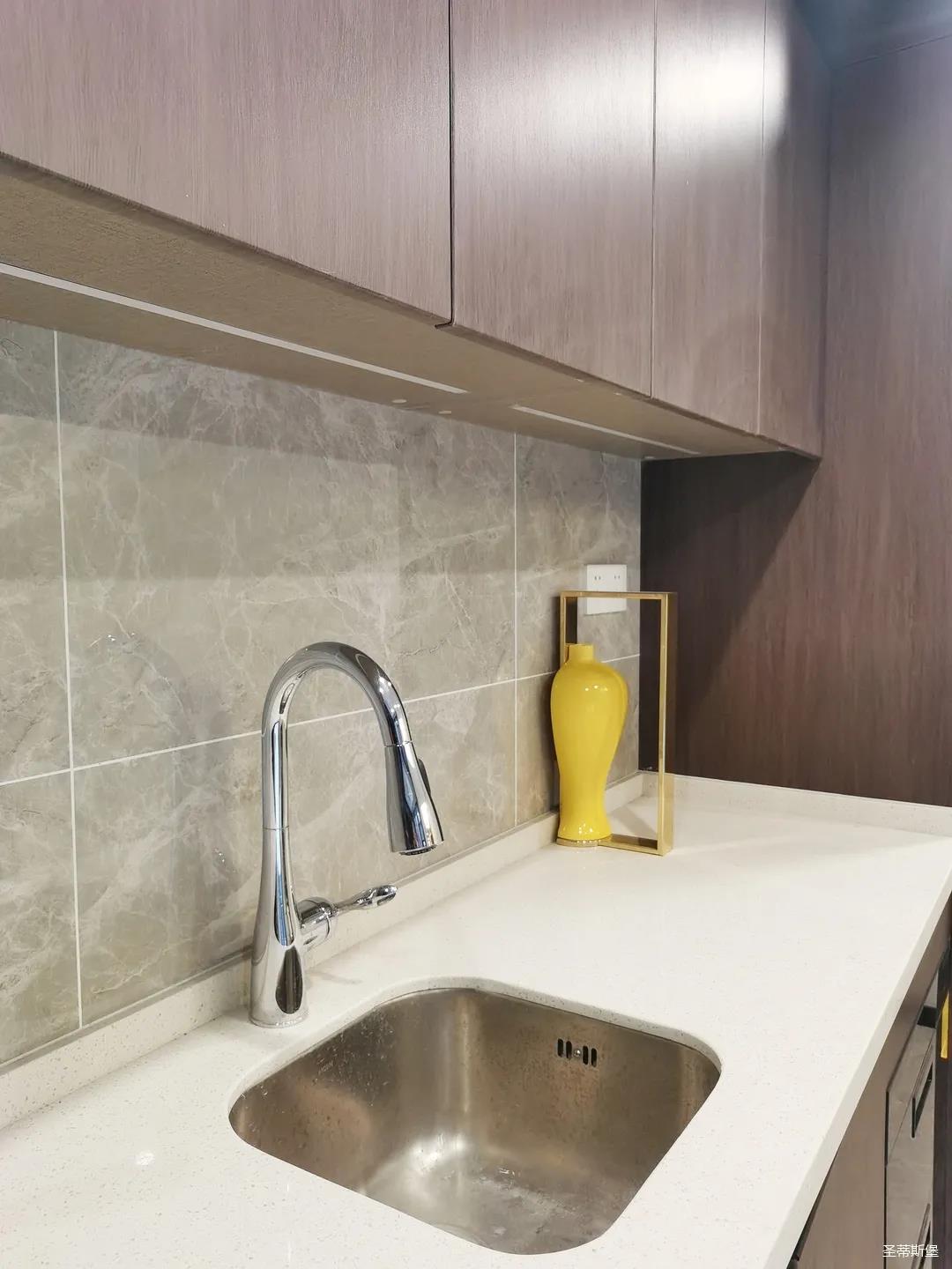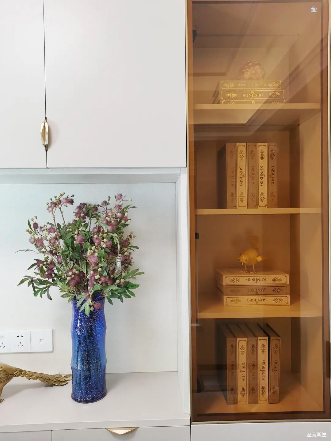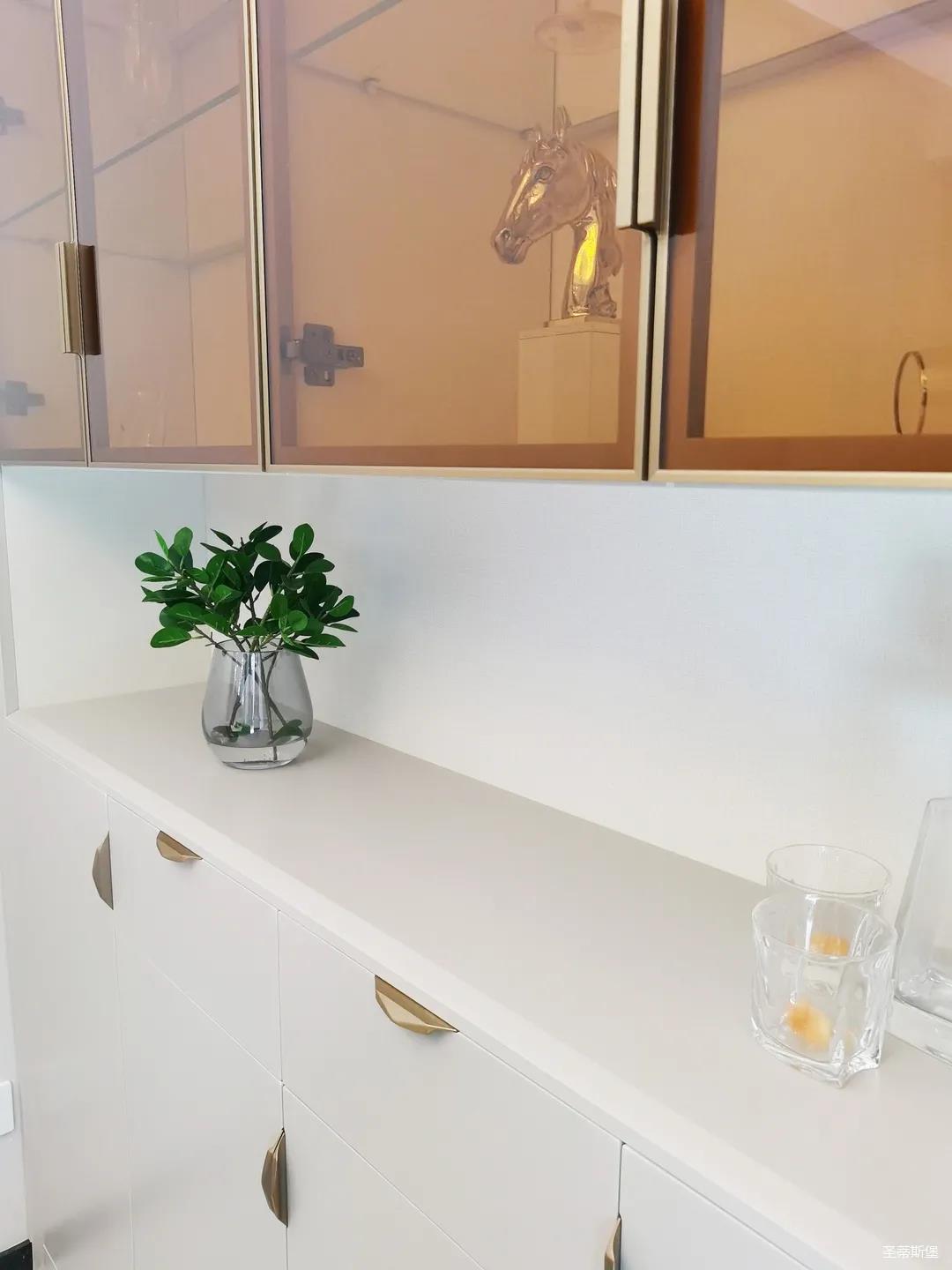 開放式的餐廚設(shè)計(jì)讓餐邊柜和櫥柜的居家動(dòng)線更為流暢,成了最便利的收納場(chǎng)所,生活小資而又美好。