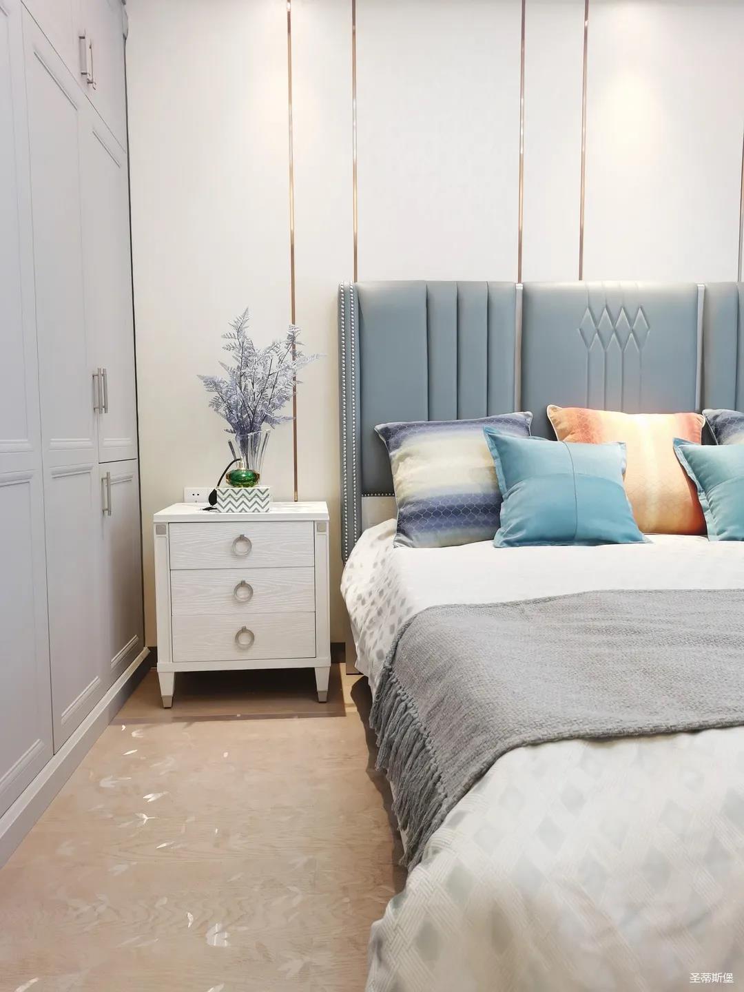 一樓的房間業(yè)主是作為長(zhǎng)輩房,采用輕奢的背景墻面,結(jié)合亮眼的金屬線條設(shè)計(jì),空間顯得時(shí)尚又不失沉穩(wěn)。莫蘭迪色的淺藍(lán)床屏,在無主燈設(shè)計(jì)與自然光線的碰撞下醞釀出不同的光影美感。