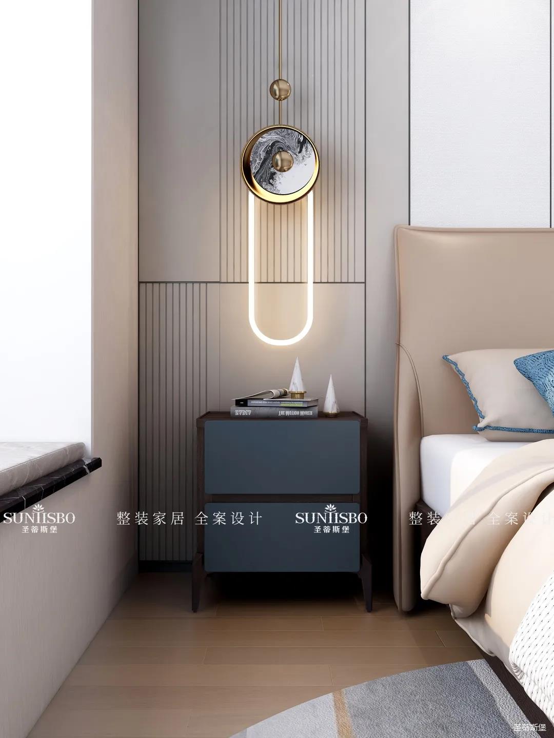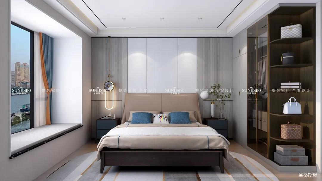 臥室把自然光線納入空間。穩(wěn)重的淺咖色床屏搭配柔和的灰白護墻,渲染了空間去繁從簡的設(shè)計。品質(zhì)精致的床品面料觸感自然柔軟,真皮質(zhì)地的家具匹配空間氣質(zhì),為業(yè)主營造了舒適愜意的休憩空間。