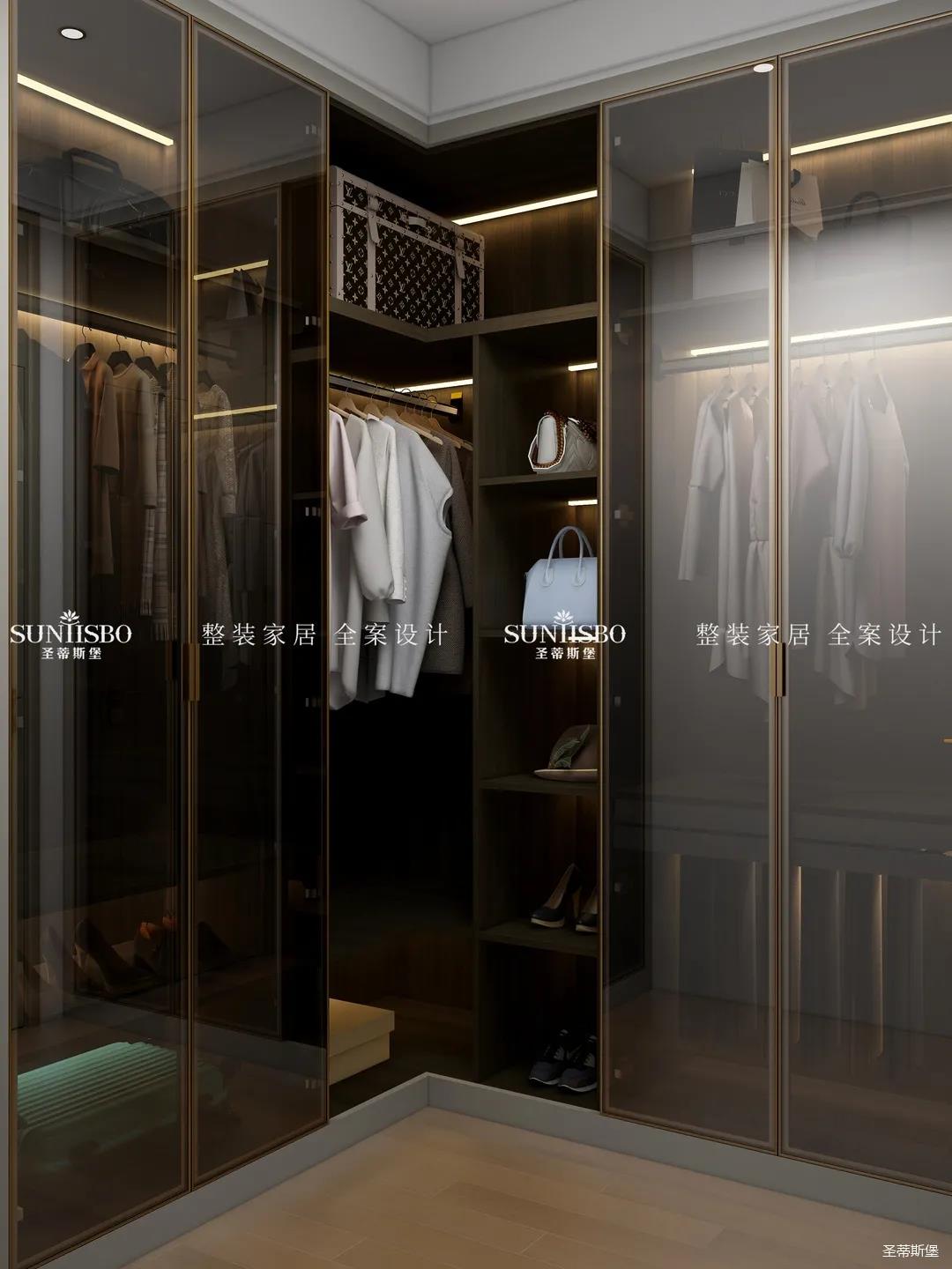 L型衣帽間采用了玻璃與實木組合,用時尚的煙熏色打造純凈質(zhì)感,避免了全實木柜門的無趣。人性化的分區(qū)包含了鞋架、褲架、首飾收納等,將衣帽間的實用性靈活設(shè)計成業(yè)主的收納習慣。